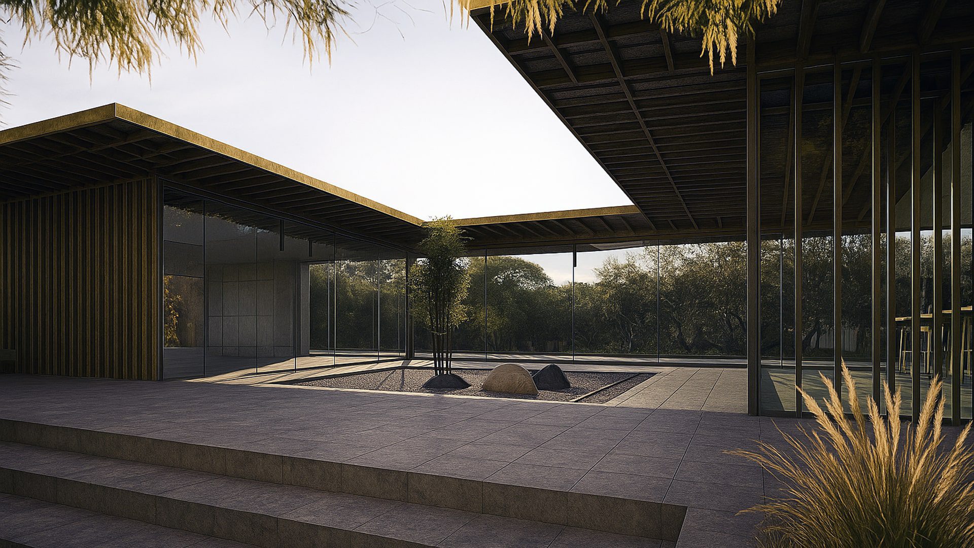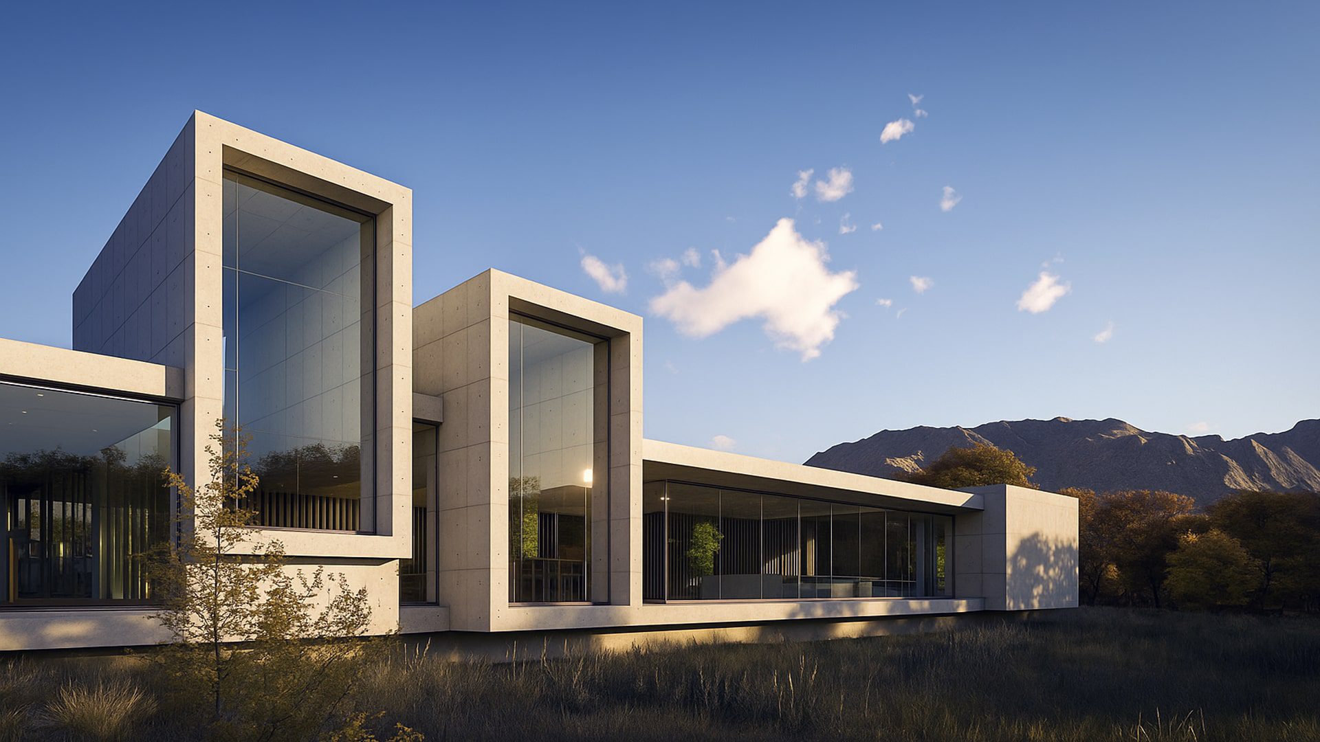 A house that is made of concrete and glass.