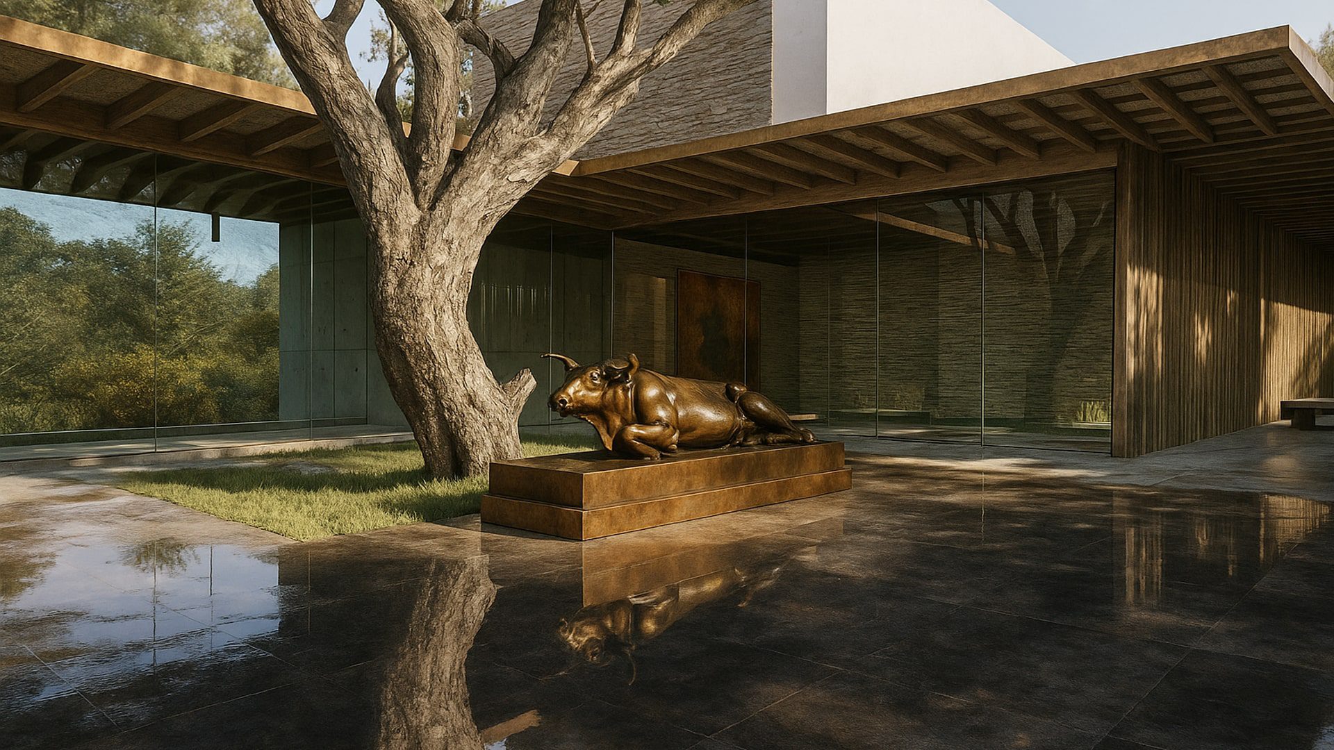 Dominating this serene assembly is an ancient tree, its boughs sprawling overhead in a protective embrace, casting a lacework of shadows upon the gleaming glass. The architects, in their vision, chose to pay homage to this sentinel of the earth, integrating its presence into the very essence of the center, allowing its age-old wisdom to permeate the space.